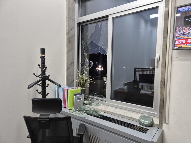 군 진입 후 유리창이 깨진 국민의힘 정책위 의장실