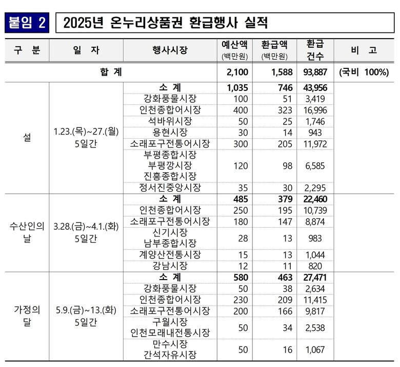 인천시는 올해 설 명절, 수산인의 날, 가정의 달 등 총 3차례에 걸쳐 온누리상품권 할인행사를 추진했으며, 약 9만 4천 명 시민에게 15억 9천만 원 상당의 온누리상품권을 환급한 바 있다.
