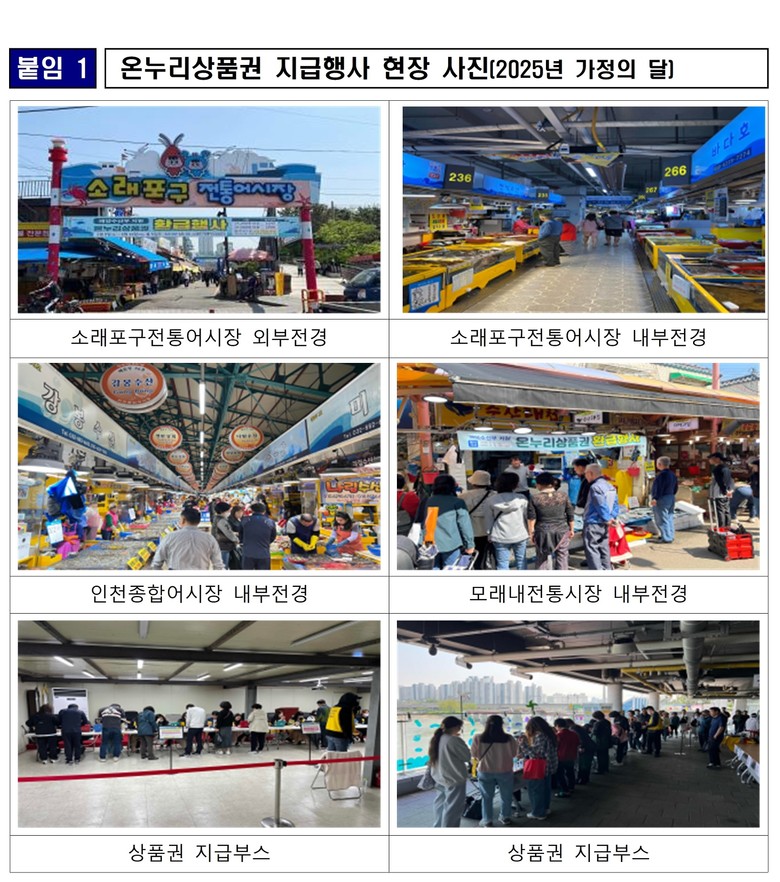 - 수산물 소비 촉진과 장바구니 체감 물가 완화로 시민 체감 혜택 강화 - [인천 세계타임즈=심하린 기자] 인천광역시(시장 유정복)는 여름휴가 시기를 맞아 전통시장과 수산물 소비 활성화 및 장바구니 체감 물가 완화를 위해 8월 1일부터 8월 5일까지 5일간 전통시장 5개소에서 ‘온누리상품권 환급행사’를 진행한다고 밝혔다.