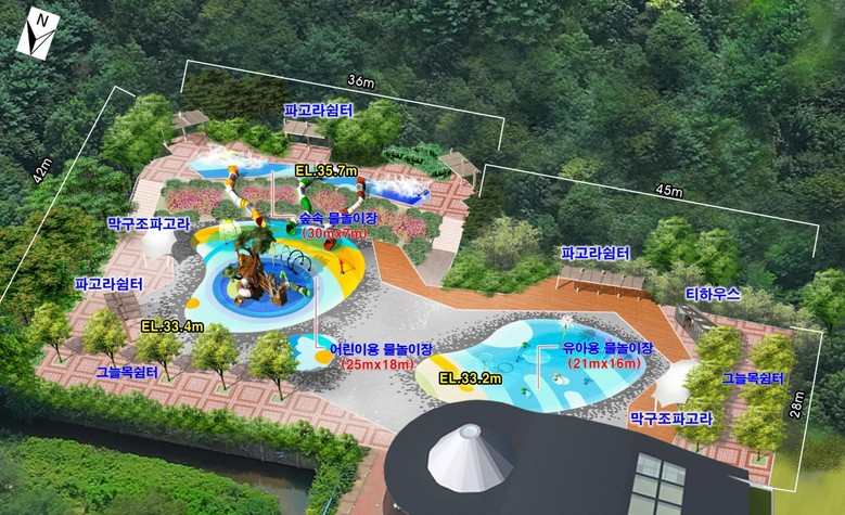 물놀이장은 약 38억 원을 투자해 총면적 3,930㎡ 규모로 조성했으며, 어린이·유아용 물놀이장, 워터슬라이드, 샤워시설, 탈의실, 휴게음식점 등 다양한 편의시설을 갖추고 있다. 수심은 어린이의 안전을 고려해 25㎝를 넘지 않도록 설계했다.