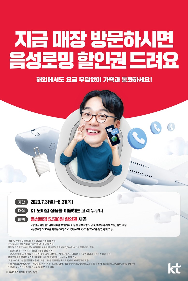 KT는 매장에 방문하는 모바일 고객을 대상으로 8월 31일까지 사용할 수 있는 ‘음성 로밍 5,500원(VAT포함) 할인권’을 제공한다. 매장 내 비치된 QR코드로 간단한 본인인증 후 매장 직원에게 보여주면 할인권이 등록된다.