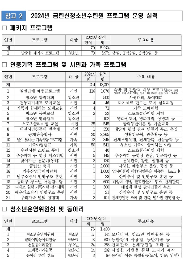 이외에도 청소년과 시민, 가족 단위로 참여하는 공개관측행사, 별이 빛나는 가족사랑 프로그램, 청소년활동 대표 축제인 금련산 축제 등 다양한 참여형 프로그램을 운영 중이다.