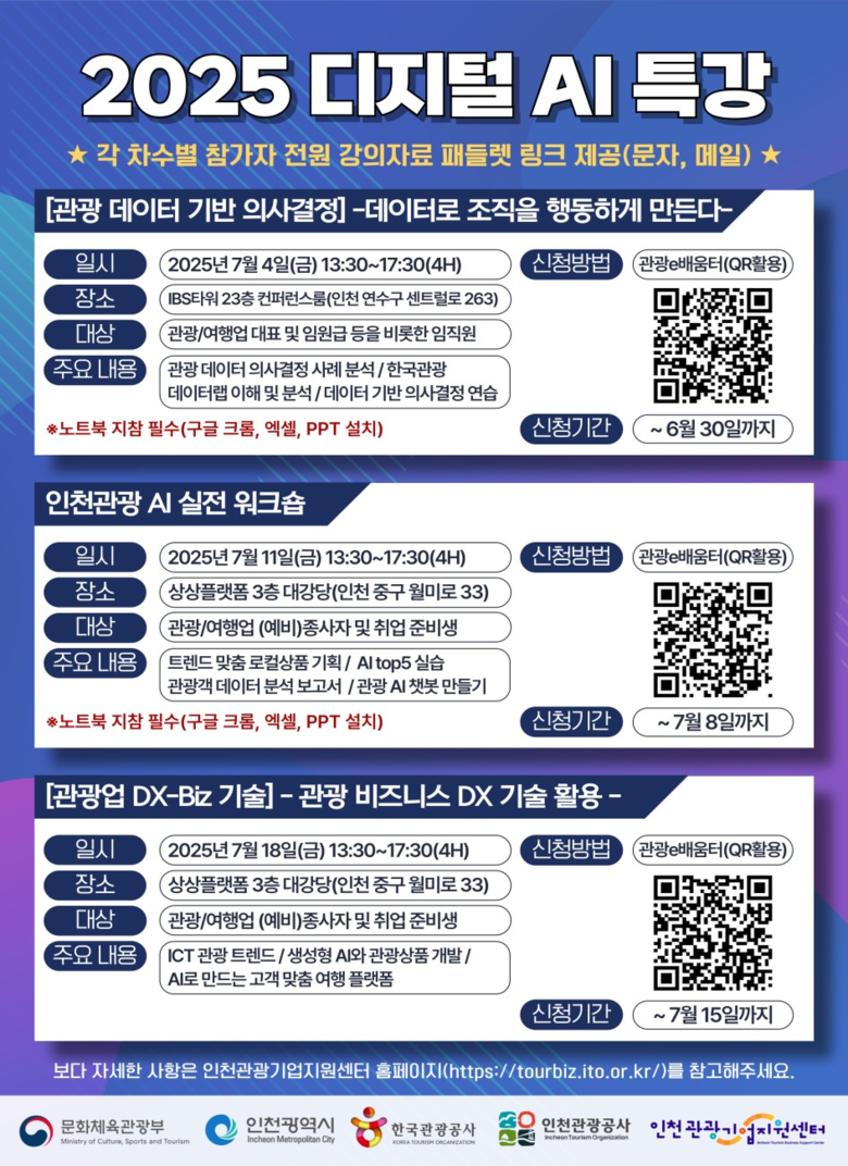 - 관광업계 디지털 전환 및 인공지능(AI) 활용 관련 실습 중심 교육 진행 - [인천 세계타임즈=심하린 기자] 인천광역시(시장 유정복)와 인천관광공사(사장 백현)는 한국관광공사(사장직무대행 서영충)와 함께 지역 관광업계의 디지털 전환과 인공지능(AI) 활용 역량 강화를 위한 ‘디지털 AI 특강’을 오는 7월 4일부터 18일까지 매주 금요일 총 3회에 걸쳐 진행한다고 밝혔다.