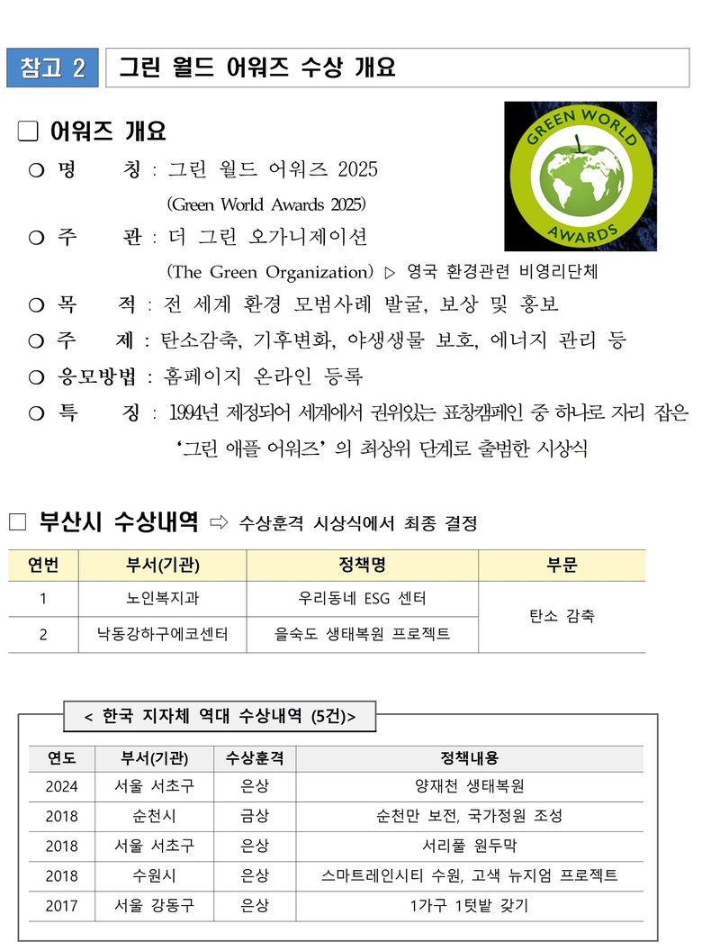 ◈ 박형준 시장, “부산시민들이 누리고 있는 정책들은 세계적으로도 손색없는 수준으로, 앞으로도 더 많은 정책을 국제사회와 공유하며 발전시켜 가겠다”라고 밝혀 [부산 세계타임즈=이용우 기자] 부산시(시장 박형준)는 '우리동네 사회가치경영(ESG) 센터'와 '을숙도 생태복원 프로젝트' 총 2개 정책이 「2025 그린 월드 어워즈(Green World Awards 2025)」 수상작으로 선정됐다고 밝혔다.