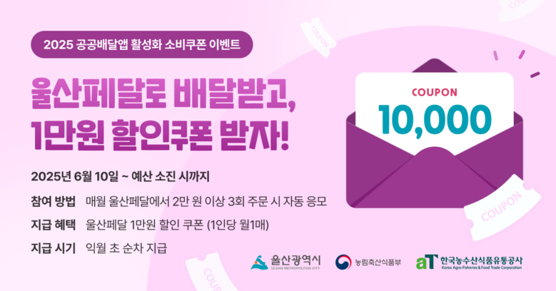 울산시는 농림축산식품부가 추경 예산 650억 원으로 시행하는 ‘공공배달앱 활성화 소비쿠폰 사업’에 동참해, 울산페달을 통해 1만 원 할인쿠폰 행사를 실시한다고 밝혔다.