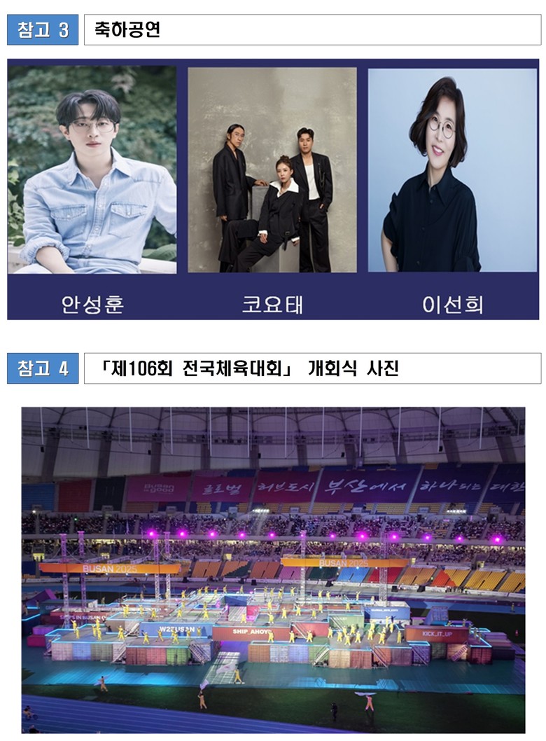 한편, 개회식의 마지막 축하공연에는 ▲트로트 가수 안성훈 ▲혼성그룹 코요태 ▲국민 가수 이선희가 출연해 개회식의 피날레를 장식한다.