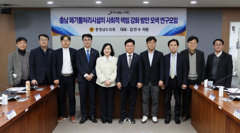 김민수 의원(비례·더불어민주당)이 연구모임 대표를, 충남도 환경관리과 폐기물관리팀 윤태근 팀장이 간사를 맡았으며, 충남도의회 신순옥 의원(비례·국민의힘), 박정수 의원(천안9·국민의힘), 정병인 의원(천안8·더불어민주당), 한국환경공단 충청권환경본부 한행석 부장, 충남개발공사 환경사업부 박주관 부장, 공익법률센터 농본 하승수 변호사, 사회적협동조합 금강 정종관 이사장, 충남도 환경관리과 황은성 과장, 대기환경과 도중원 과장 등 11명으로 구성됐다.
