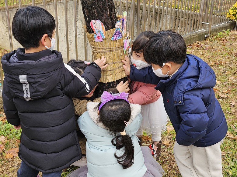 먼저 유아들과 함께‘식물이 겨울을 나는 방식’과 지푸라기를 활용한 잠복소(보온 덮개)의 개념을 설명하고, 활동의 구체적인 방법과 유의사항(나무 손상 방지. 안전거리 유지 등)을 이야기한 후 프로젝트를 시작하였다. 이후 각 모둠은 자신들이 정한 나무 주변에 지푸라기를 둘러 감고 끈으로 묶는 방식으로 따뜻한 ‘옷’을 입히는 잠복소를 입혀주고 그림과 사랑의 메시지를 선물하며 추운 겨울을 잘 이겨낼 수 있도록 나무에게 힘을 주며 정서적으로 교감을 나누었다.
