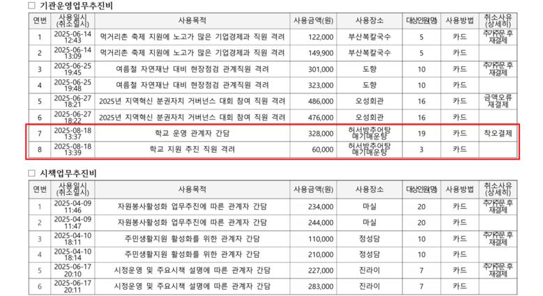 또한 해당 식사비는 기관운영업무추진비로 결제되었으며 민간단체에 기관운영업무추진비 사용은 용도에 맞지 않는 법인카드 사용이며 공직선거법 위반과 별개로 시민의 혈세 낭비라고 비판했다.