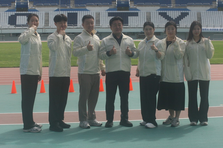| ▲13일 경기도장애인체육회 관계자들이 파주스타디움 주경기장에서 기념촬영을 하고 있다. |