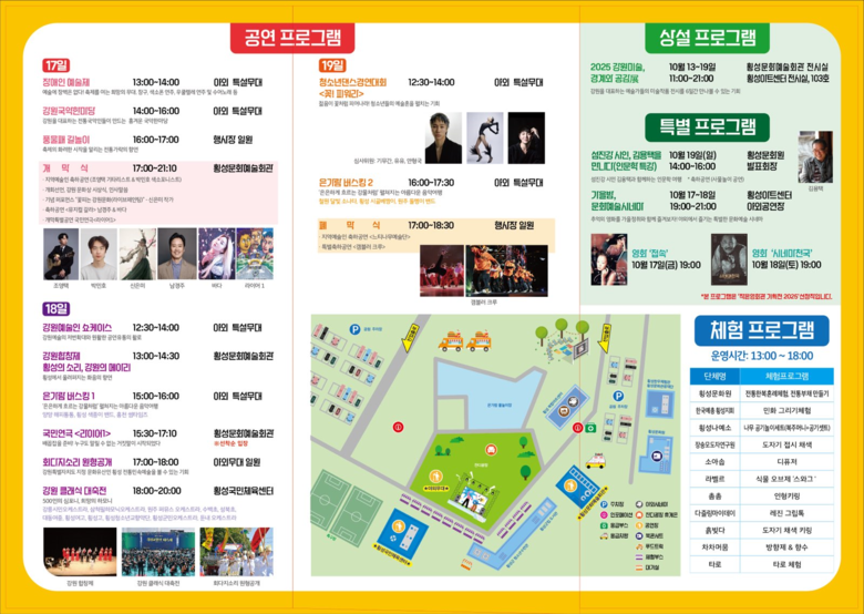 - (지역예술인 공연 및 전시) △2025 강원미술 경계와 공감展, △강원국악한마당, △풍물패 길놀이, △강원합창제, △강원클래식대축전, △은가람버스킹 등