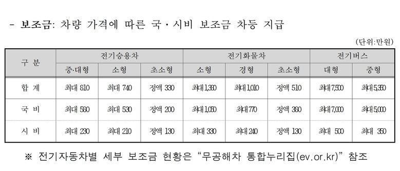 구매보조금으로 ▲승용차는 1대당 최대 810만 원 ▲화물차는 1대당 최대 1천380만 원 ▲어린이통학차는 1대당 최대 1억2천만 원을 지원한다. 단, 구매 차량의 가격별로 구매보조금은 차등 지급된다.