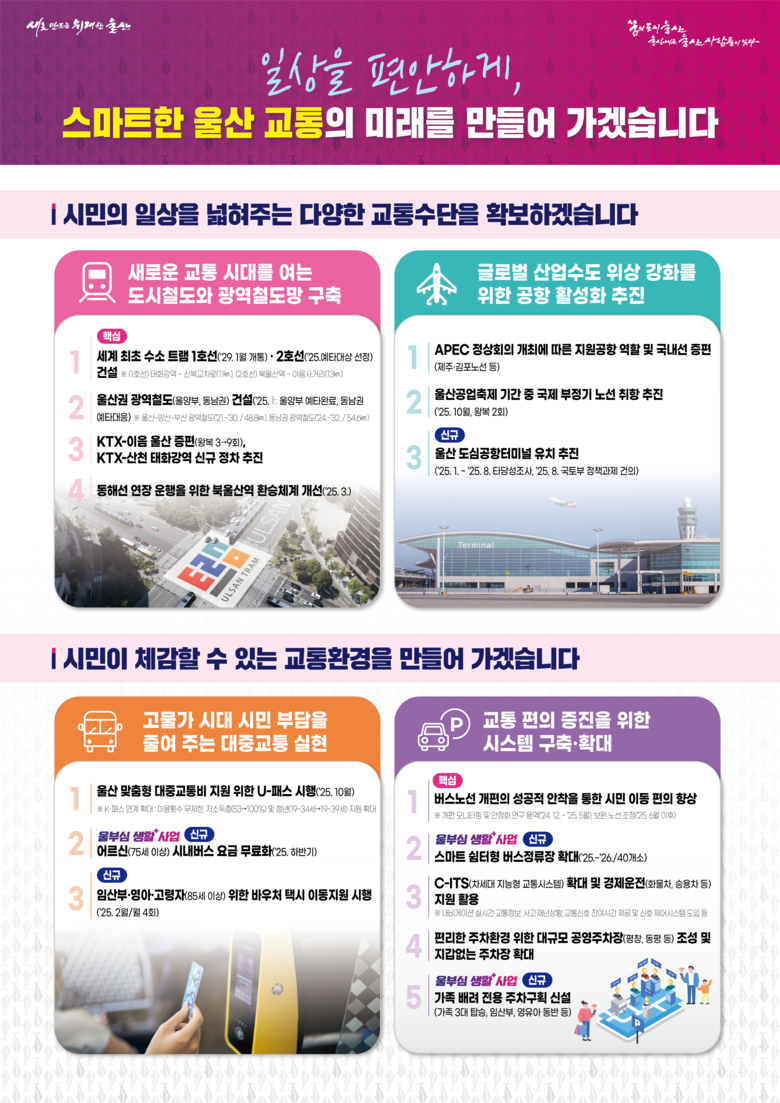 2025년 교통 분야 정책 방향은 “시민의 일상을 편안하게, 지능형(스마트) 울산 교통의 미래를 만든다”를 목표로 △시민의 일상을 넓혀주는 다양한 교통수단 확보 △시민이 체감할 수 있는 교통환경 조성에 주력한다.