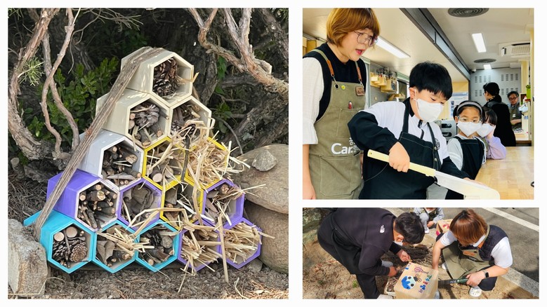 학생들은 카멜레온 차량에 있는 목공 도구를 활용해 다양한 곤충이 서식할 수 있는 곤충 호텔을 직접 디자인하고 제작했다. 완성된 곤충 호텔은 학교와 마을의 필요한 공간에 설치했다.
