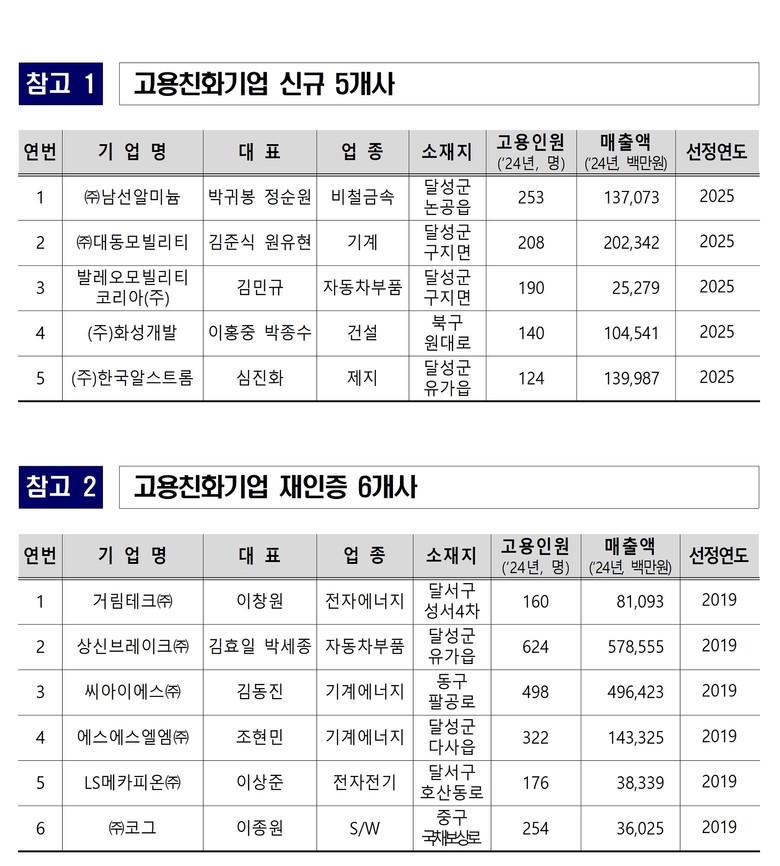 이와 함께, 올해 재인증을 받은 고용친화기업으로는 ▲거림테크㈜ ▲상신브레이크㈜ ▲씨아이에스㈜ ▲에스에스엘엠㈜ ▲엘에스메카피온㈜ ▲㈜코그 총 6곳이 선정됐다.