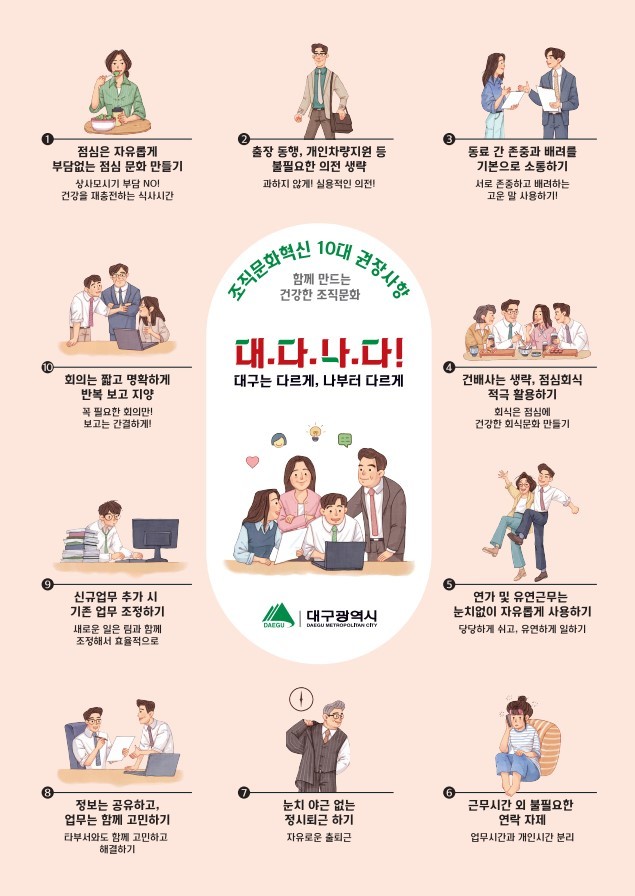 오준혁 대구광역시 기획조정실장은 “이번 캠페인은 조직문화 혁신 10대 권장사항이 기존 조직문화에 자연스럽게 스며들 수 있는 계기가 될 것이다”며, “직원 모두가 존중받고 부담 없이 일할 수 있는 공직문화가 정착되도록 앞장서겠다”고 말했다.
