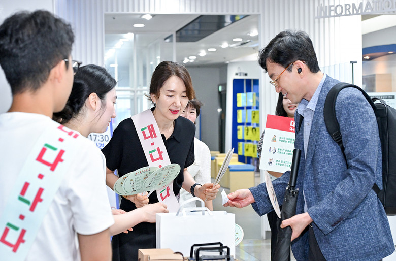 참가자들은 ‘대.다.나.다!(대구는 다르게, 나부터 다르게)’라는 혁신 슬로건 문구가 적힌 어깨띠를 착용하고, 출근하는 직원들에게 10대 권장사항이 적힌 리플릿과 부채를 나눠주며 건강한 조직문화 조성 의지를 다졌다.