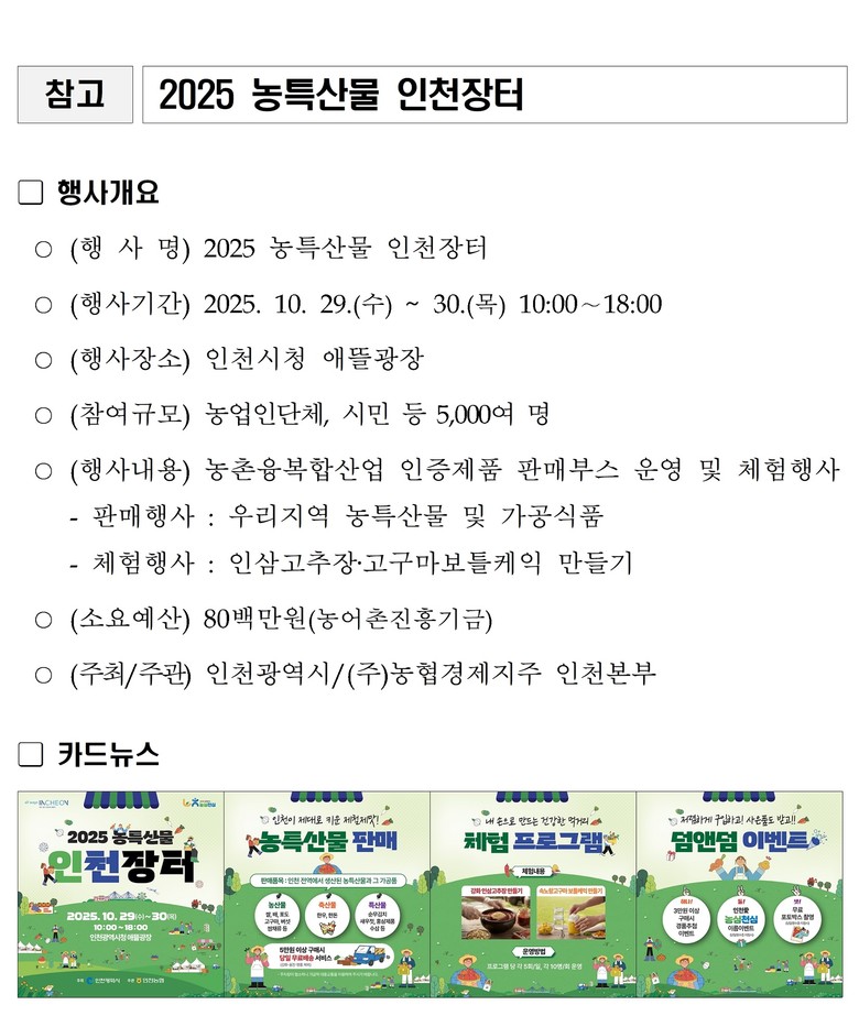 행사 관련 자세한 사항은 인천시 누리집(www.incheon.go.kr)을 참조하거나 시 농축산과(☏440-4388)로 문의하면 된다.