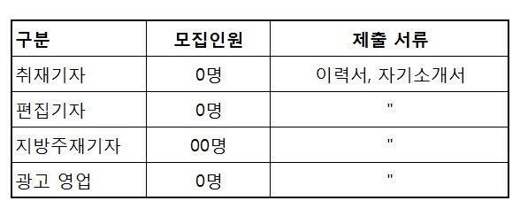 모집 분야는 취재 부문(본사 및 지방), 편집 부문, 광고영업 부문입니다.
