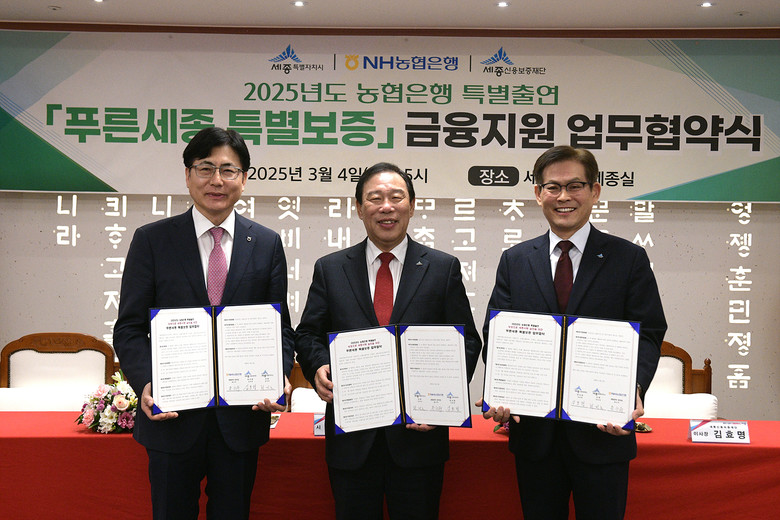 이날 협약식에는 최민호 시장, 홍순옥 농협은행 세종본부장, 김효명 세종신용보증재단 이사장이 참석해 지역 경제 활성화를 위한 긴밀한 협력을 다짐했다.
