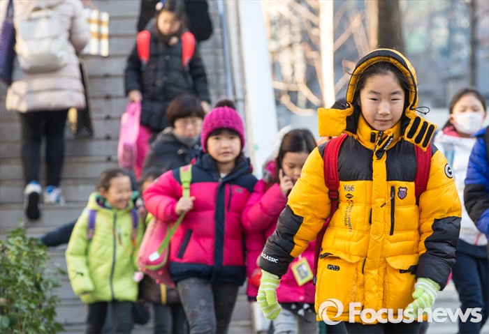 (서울=포커스뉴스) 절기상 대설인 7일 오전 서울 서대문구 미동초등학교에서 두꺼운 옷을 껴입은 어린이들이 등굣길에 오르고 있다. 기상청은 전국이 고기압의 영향으로 맑은 하늘을 보이며 한낮에는 기온이 크게 오를 것으로 전망했다.