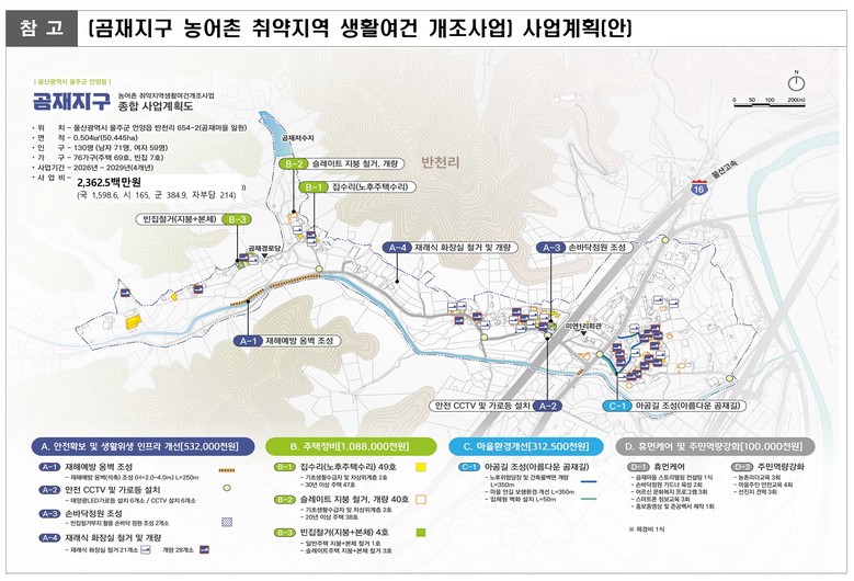 이번 사업을 통해 곰재마을에는 ▲노후 슬레이트 지붕 정비(49호) ▲재래식 화장실 개량(49호) ▲빈집 철거(4호) ▲재해예방 옹벽 조성(250m) ▲CCTV 및 가로등 설치(6개소) 등 주거환경 및 안전기반 확충 사업이 대대적으로 추진된다.