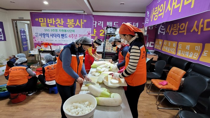 [대전=세계타임즈 이채봉 기자] 9천명 SNS 대전시 봉사단체 사랑의 사다리 밴드(리더 이정제)는 지난18일 오전9시, 대덕구 중리동에 위치한 사랑의 사다리 밴드 사무실에서 서구지역 소외계층 40가정에 밑반찬 봉사로 우리 사회의 따뜻한 사랑을 실천하였다.