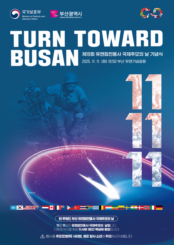 박형준 시장은 “11월 11일 오전 11시, 세계 유일의 유엔기념공원이 있는 부산을 향한 추모 묵념에 시민들의 참여를 당부드린다”라며, “부산은 유엔 참전국과 유엔참전용사들이 지켜낸 자유와 평화의 가치와 소중함을 잊지 않고, 세계평화의 상징 도시로서 유엔참전용사들의 고귀한 뜻을 이어가겠다”라고 전했다.