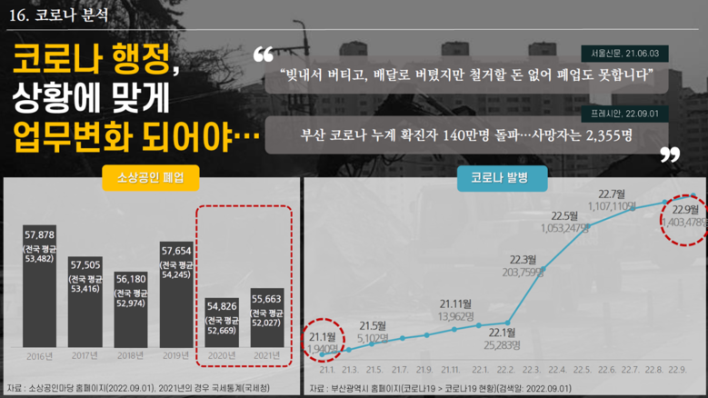 마지막으로 답변에 나선 이병진 부시장에게는 현재 부산의 민생, 경제와 관련된 각종 지표가 전국 최하위를 기록하고 있다고 지적하였다. 이에 더해 3년 이상 지속된 코로나 팬데믹으로 인하여 부산시민 삶은 갈수록 피폐해지고 있다고 문제 삼고 나섰다. (PT 14~15)