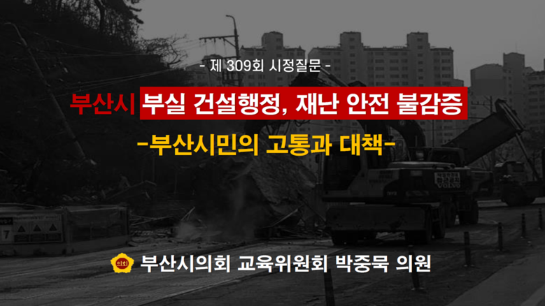 ⇒ ‘시민중심 기본행정 정립’을 통한 부산시정‘신뢰’회복 나서야 [부산 세계타임즈=이용우 기자] 박중묵 의원(동래구 1, 교육위원회)는 제309회 시정질문에서 오랫동안 지속된 부산시의 ‘부실한 건설행정’과 ‘안일한 방재행정’으로 인하여 무고한 부산시민에게 피해만 떠넘기는 무책임한 시정에 대해 강도 높게 질타했다.