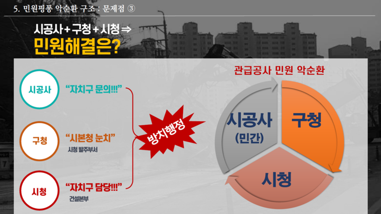 박 의원이 주민들의 민원을 실제 분석해본 결과, 부산시의 관급공사장 관련 민원은 ‘구청→시청→건설본부→시공사’로 이어지는‘핑퐁(탁구공)의 악순환 구조’로 고착화되어 있으며, 주민의 대의기관인 시의원 등 선출직이 개입해야만 겨우 대책을 강구하는 무사안일한 ‘건설행정 관행’이 오랜 기간 지속되고 있다고 질타하였다. (PT 4, 5)