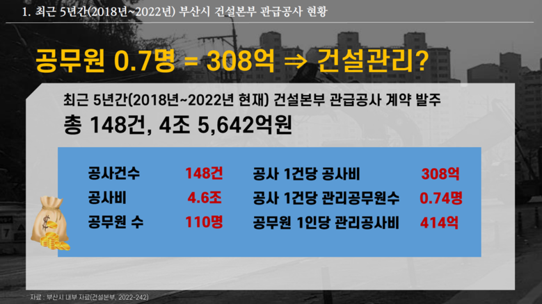 먼저, 박 의원은 부산시가 제출한 ‘최근 5년간(2018~2022년) 관급공사계약 발주현황’에 따르면, 총 148건(4조 5,642억 원) 공사에 감독관은 110명이 배치되어 있다고 설명했다. 이는 관급공사 한 건당 약 0.7명의 감독관이 배치되어 건설 공사에서 필연적으로 발생하는 소음 민원 등 충분히 예상되는 상황에도 제대로 된 대응과 공사 관리·감독이 이뤄질 수 없는 구조라고 주장하였다. (PT 1)