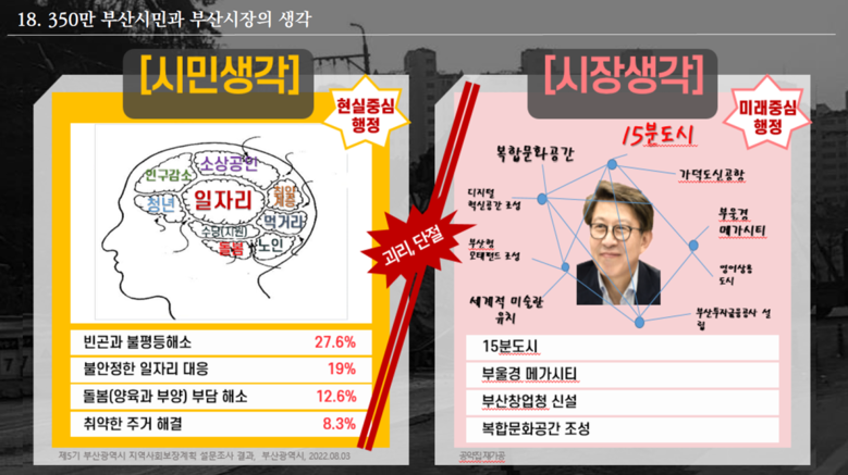 이에 오랜시간 관행으로 포장되어 이어져 온 부산시의 여러 부실한 시정에 대해서는 지금이라도 과감하게 개선하고 버릴 것을 주문하면서, 부산시민에게 가장 필요한 ‘시민 중심의 기본행정’을 정립하여 강력하게 추진해 나갈 것을 당부하였다. (PT 16~22)