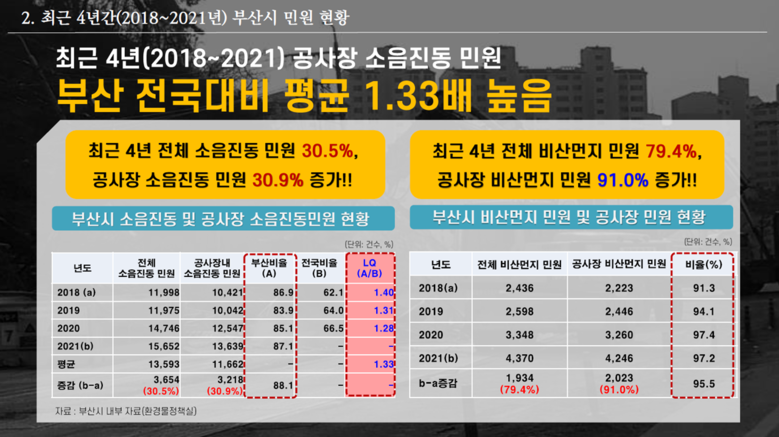또한, 부산시의 소음민원 중 ‘공사장 민원’이 전국 평균 보다 1.3배 이상 높고, ‘비산먼지 민원’ 역시 해마다 급증하여 공사장에서 ‘비산먼지 민원 전체의 95%’나 발생하고 있다고 분석했다.
