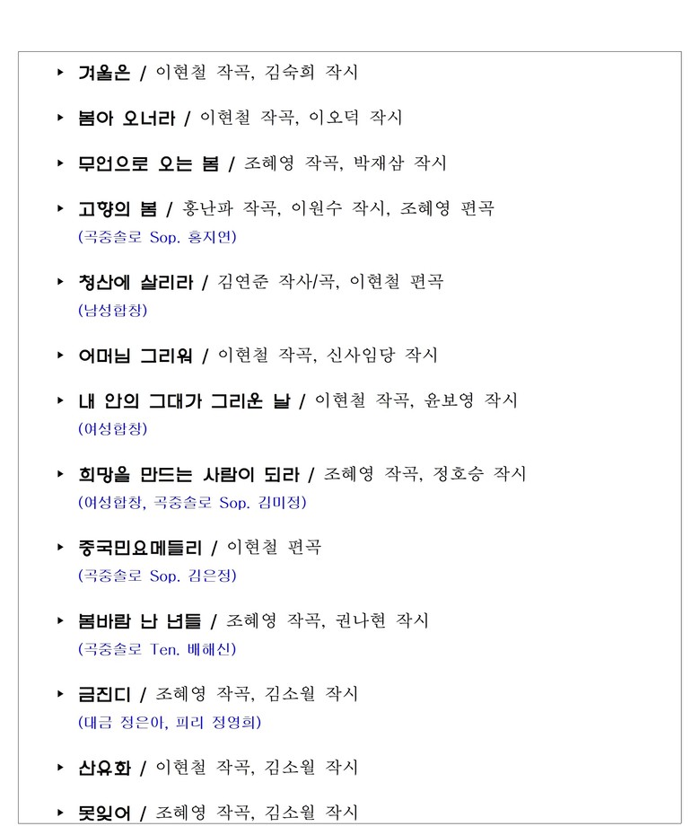 이현철 작곡가의「겨울은」,「봄아 오너라」,「청산에 살리라」,「어머님 그리워」,「내 안의 그대가 그리운 날」, 「산유화」와 조혜영 작곡가의「무언으로 오는 봄」,「고향의 봄」,「희망을 만드는 사람이 되라」,「봄바람 난 년들」, 「금잔디」, 「못잊어」가 연주된다.