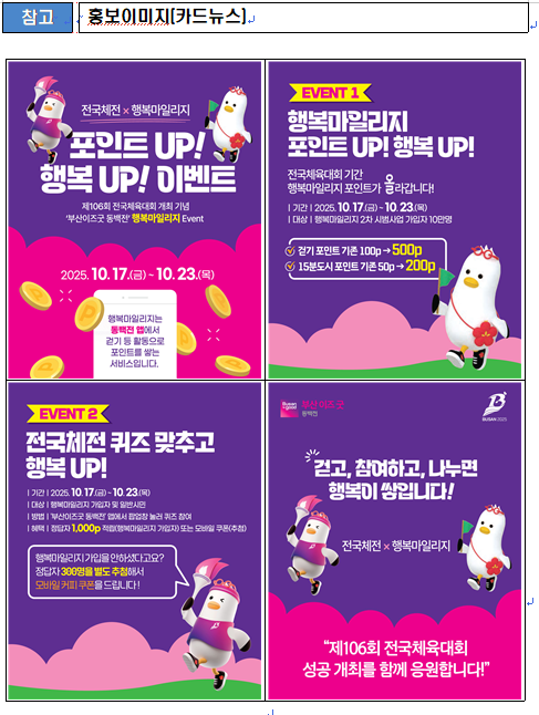 ◈ ▲[행복마일리지 가입자] 퀴즈 이벤트 정답자 1,000포인트 지급, ▲[일반시민 누구나] 300명 추첨 모바일 쿠폰 증정 [부산 세계타임즈=이용우 기자] 부산시(시장 박형준)는 제106회 전국체육대회 개최를 기념하여 부산이즈굿 동백전 「행복마일리지」 특별 이벤트인 '포인트 업(UP)! 행복 업(UP)!'을 오는 10월 17일부터 23일까지 7일간 추진한다고 밝혔다.