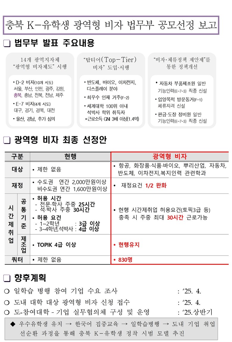 이번에 선정된 광역형 유학비자(D-2)는 항공산업, 화장품·식품·바이오 산업, 뿌리산업, 이차전지, 반도체, 복지 관련 학과 등 지역산업 관련학과 유학생의 비자발급을 위한 재정요건이 완화되었으며, TOPIK 3급 이상의 경우 주중 최대 30시간까지 시간제 취업이 가능해졌다. 다만, 제조업 분야는 기존과 같이 TOPIK 4급 이상이 요구된다. 충북도는 2026년까지 830명의 유학생에게 광역형 비자가 발급될 예정이다.