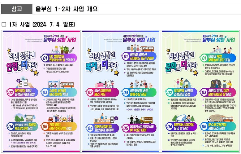 울부심 생활 플러스 사업은 민선 8기 후반기 역점 시책으로 시민들의 시정에 대한 체감도와 만족도를 높이고 울산 시민으로서의 자부심을 고취하기 위해 생활안정+(플러스), 생활복지+, 생활문화+ 등 3대 분야로 추진된다.