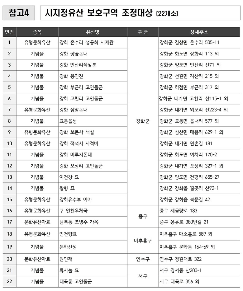인천시는 시지정유산 113개소 전체를 대상으로 가치 변화, 보존 상태, 주변 환경 등을 종합 검토해 보호구역 22개소를 합리적으로 조정했다.