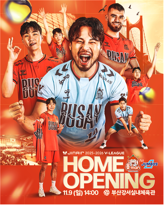 이날 개막전은 ▲박형준 부산시장을 비롯해 ▲최윤 오케이(OK) 읏맨 배구단 구단주 ▲조원태 한국배구연맹 총재 ▲관람객 4천여 명이 입장한 가운데 오케이(OK) 읏맨 배구단의 공식적인 부산시대를 알리는 첫 홈경기가 치러질 예정이다.