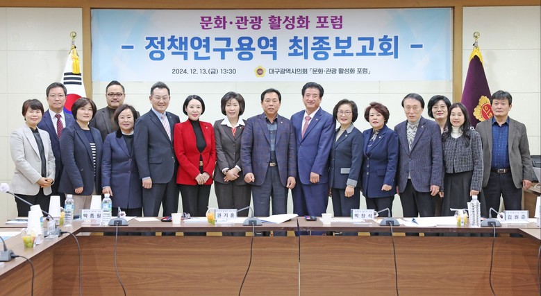 [대구 세계타임즈=한윤석 기자] 대구시의회 의원연구단체 ‘문화ㆍ관광 활성화 포럼’(대표 권기훈 의원)은 12월 13일(금), 의회 3층 회의실에서 소속 의원이 참석한 가운데 ‘대구아리랑 문화ㆍ관광 활성화 방안’과 ‘생활인구 증가를 위한 체류형 관광지 조성방안 연구’ 용역 최종 보고회를 개최했다.