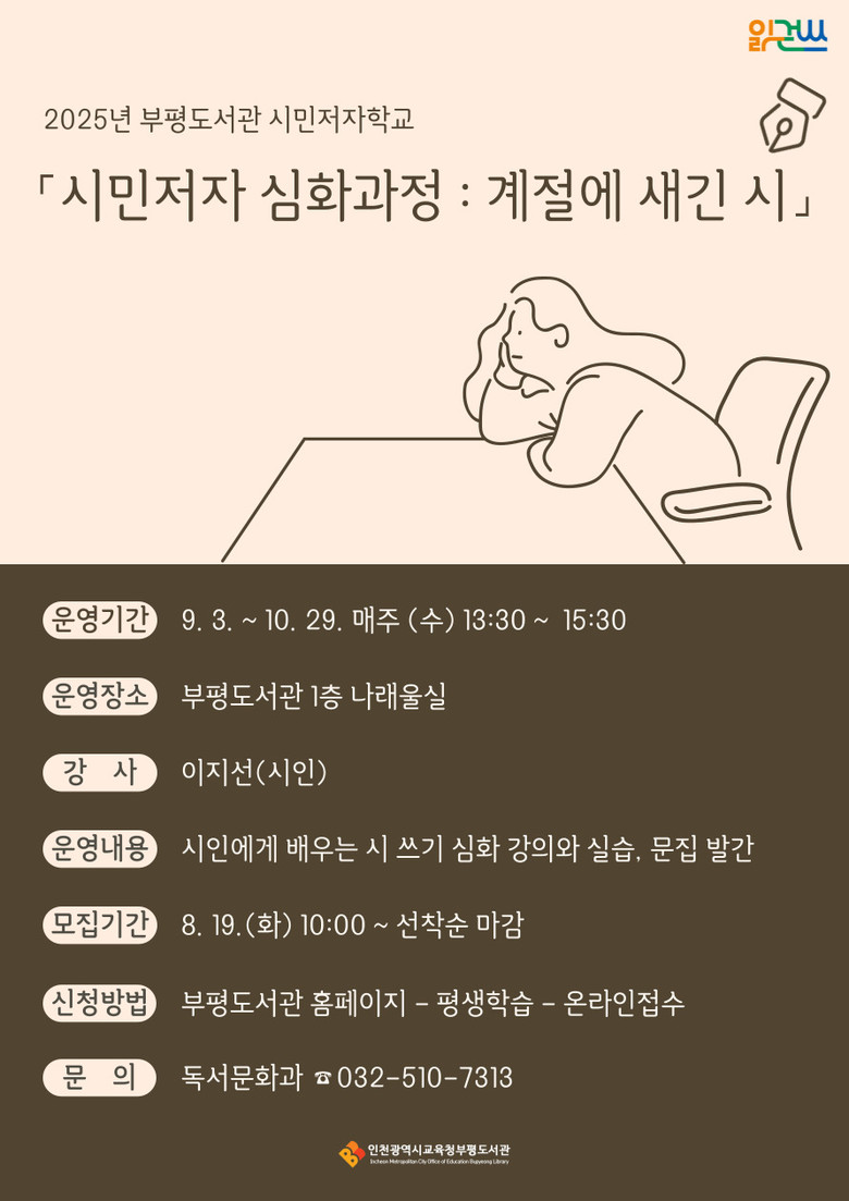 자세한 사항은 부평도서관 누리집(lib.ice.go.kr/bupyeong) 또는 독서문화과(☎032-510-7313)로 문의하면 된다.