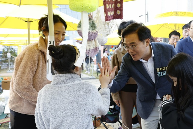| ▲ 진교훈 서울 강서구청장(오른쪽)이 25일(토) 발산근린공원에서 열린 ‘발산마을축제’에서 플리마켓에 참여한 아이와 손을 맞대고 있다. |
