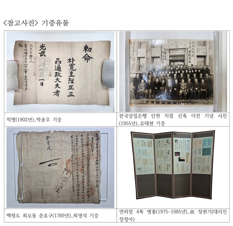 이번에 기증된 유물은 인천 시민들의 생활사 자료를 비롯해 석모도 거주 순천 박씨 집안과 백령도 거주 영암 최씨 집안의 고문서 일괄, 정휘량 묘 유물, 인천 문학계 인사인 장현기 시인 관련 자료 등 다양한 시대와 분야를 아우르는 가치 있는 기록들로 구성됐다.