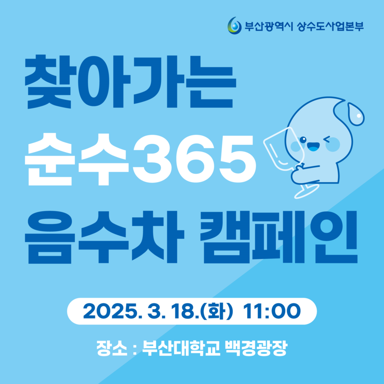 ‘찾아가는 순수365 음수차 캠페인’은 내일(18일) 오전 11시부터 오후 2시까지 부경대학교 백경광장에서 진행된다. 마셔도 안전한 수돗물이라는 시민 인식을 개선하기 위해 진행하는 이번 캠페인에서는 ‘순수365’로 만든 음료를 시음하고 미니퀴즈 게임, 이벤트 등 즐길 거리도 함께 만나볼 수 있다. 또한, 수질 전문가가 함께해 수돗물 관련 궁금증을 해결할 수 있다.