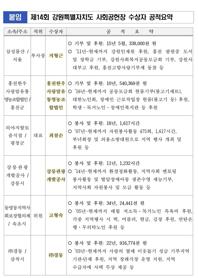 - 사랑나눔 부문 : 개인 최철순(평창), 단체 강릉관광개발공사(사장 강희문)