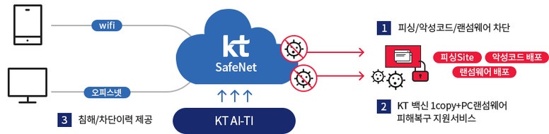 ‘KT 세이프넷’은 보안 장비를 구축하거나, 인력 없이도 인터넷 보안을 강화할 수 있는 부가서비스다. KT 인터넷 회선을 사용 중인 사업자가 서비스 청약만 하면 월 4,400원(36개월 약정 기준)으로 인터넷 보안 서비스를 이용할 수 있다.