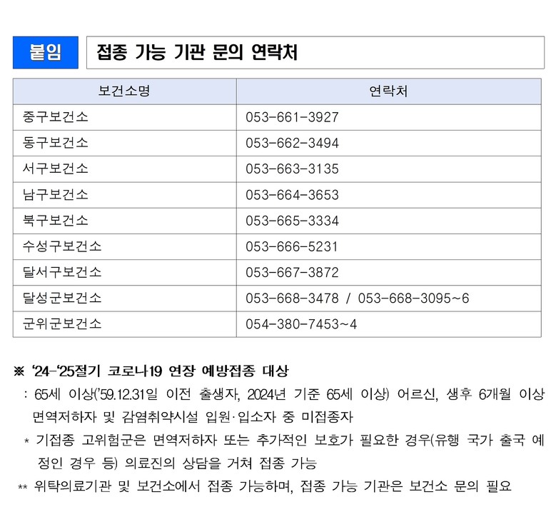 김태운 대구광역시 보건복지국장은 “’25-’26절기 코로나19 예방접종은 현재 접종 중인 JN.1 백신이 아닌 신규 백신으로 10월경 실시할 예정이며, 다음 절기 접종과의 최소 접종 간격 3개월이 지켜질 수 있도록 미접종자는 여름철 유행을 대비하여 6월 30일(월)까지 서둘러 접종을 마쳐야 한다”고 말했다.