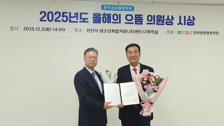 [충남 세계타임즈=이현진 기자] 방한일 충남도의원(예산1·국민의힘)이 2일 한국공공행정학회가 선정한 ‘2025 올해의 으뜸 의원상’을 수상했다.