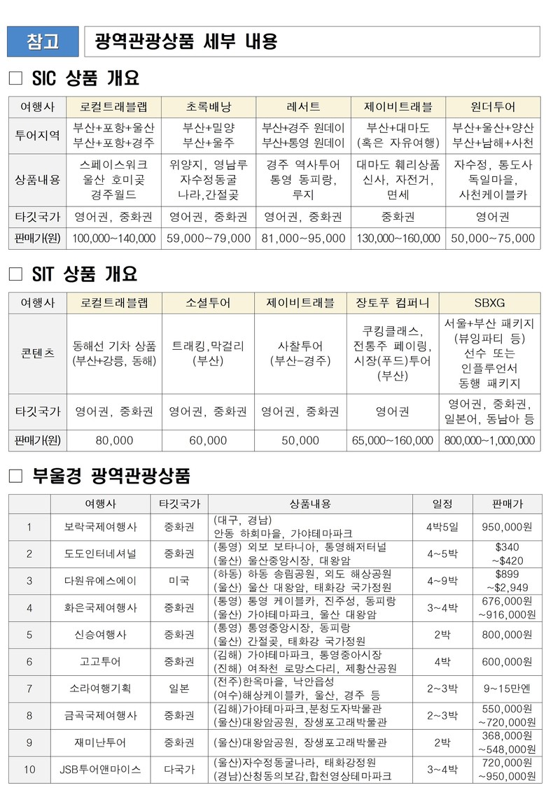* 원데이 투어상품(SIC, Seat In Coach): 부산 체류 관광객 대상 버스 등을 통한 인근도시 여행 편의 제공 상품